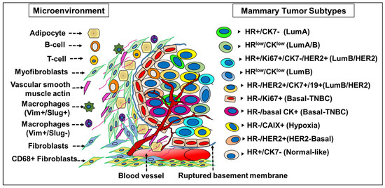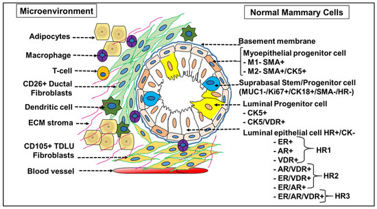 The human mammary gland is a highly heterogeneous organ and is equally dynamic, with multiple stages of remodeling during the developmental stages and in the transformation from benign to malignant phase [2,26]. The cellular heterogeneity of normal mammary and tumor tissue is complex, hindering the accurate identification and categorization of cell types. The tissue homeostasis is orchestrated by an array of mammary stem cells (MaSCs), progenitors and differentiated cells. The diverse nature of breast cancer is linked to the cells-of-origin and the selection of clones that thrive despite an accumulation of genetic mutations triggering the initiation of pre-cancerous lesions. A deeper understanding about the cells-of-origin, the evolution of multiple tumor subtypes expressing diverse hormone receptors and the collective molecular mechanisms driving the disease progression would unveil novel targets and treatment options for personalized medicine. Insights from normal mammary gland biology and the differentiation states of cell fractions in normal breast tissue provide a reference classification system for breast tumors (Figure 1). The distribution of specialized cells across different tissue layers with varying sensitivities and resistance to cancer causing stimuli results in tumor clones with different clinical behaviors [27].