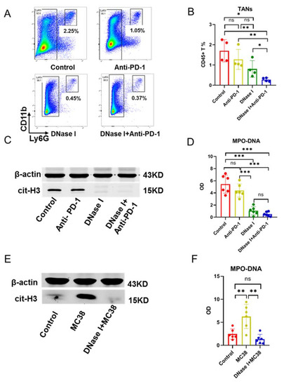 In this study, we observed a significant enhancement of anti-PD-1 treatment effect by DNase I. We hypothesized that DNase I may potentially eliminate tumor-induced NET formation to improve the PD-1 checkpoint inhibitor immunotherapies in colorectal cancer. The protein level of Cit-H3, the marker of NET formation, was remarkedly lower in the tumor tissue from the DNase I-treated and anti-PD-1 AB and DNase I combination-treated mice in comparison to control mice and those treated with anti-PD-1 AB alone (Figure 2C). Similar results were obtained when we measured the level of NETs in tumor homogenate using the MPO-DNA complex (Figure 2D). Next, we stimulated the isolated neutrophils (3 × 106/well) with control (DMEM), MC38 (106), or DNase I (100U/mL) [35] +MC38 for 4 h in vitro. We then measured the protein levels of Cit-H3 in neutrophils and the MPO-DNA level in the media. As expected, NET formation in neutrophils was increased with MC38 stimulation compared with the control group, while DNase I reversed the adverse effects of MC38 on neutrophils (Figure 2E). Similar results were obtained when we measured the level of NETs in media using the MPO-DNA complex (Figure 2F). Taken together, these findings suggest that DNase I inhibits tumor-induced NET formation in colorectal cancer.