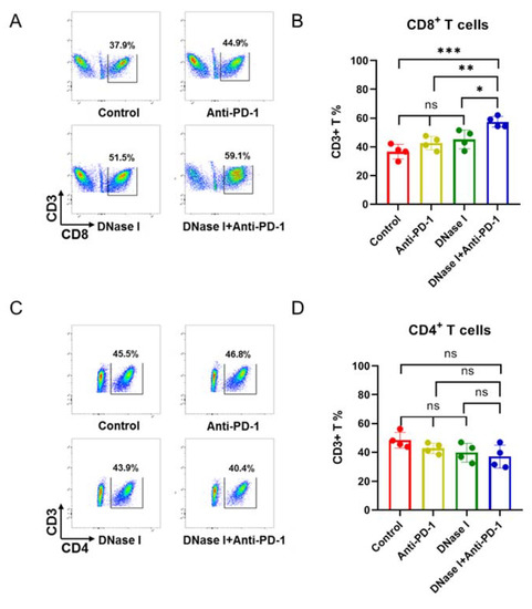 The inhibition of NETs improves the response to anti-PD-1 therapy, which is associated with a lack of CD8+ T cell infiltration. (A,B) Percentages of CD8+ T cells within the tumors from mice undergoing different treatments; n = 4 mice/group. (C,D) Percentages of CD4+ T cells within the tumors from mice undergoing different treatments; n = 4 mice/group. The graphs show the means ± SD (B,D). ANOVA was performed with adjustment for multiple comparisons for (B,D). Note: * p < 0.05, ** p < 0.01, *** p < 0.001; NS: not significant. All statistical tests used in this figure were two-sided and p < 0.05 was considered statistically significant.