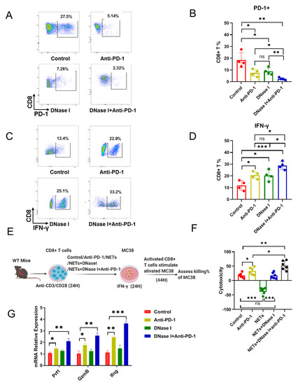 Interferon (IFN)-γ acts directly on CD8+ T cells to increase their abundance. It also acts as a cytotoxic CD8+ T cell differentiation signal [36]. We hypothesized that NETs would inhibit the activation of CD8+ T cells, despite treatment with PD-1 blockade immunotherapy in CRC. We first examined the percentages of PD-1+ CD8+ T cells following treatments with either anti-PD-1, DNase I, or both. The goal was to identify a significant decrease in the expression of PD-1 and to reveal a significant decrease in antigen-specific CD8+ T cells. The combination treatment resulted in a further decrease in the percentage of PD-1+ CD8+ T cells (Figure 4A,B); however, the percentage of IFN-γ + CD8+ T cells was significantly increased when treated with either anti-PD-1 or DNase I compared with control treated group, while the combination caused a greater increase than all other treatments (Figure 4C,D). The data above show that NET formation induced by TANs may attenuate CD8+ T cell cytotoxicity. To do so, we developed an in vitro cytotoxicity assay in which we stimulated anti-CD3 and anti-CD28-primed CD8+ T cells with control or anti-PD-1 (25 μg/mL) or isolated NETs (from 2 × 106 neutrophils/mL) or isolated NETs with DNase I (100 U/mL) for 24 h with anti-CD3 and anti-CD28, then co-incubated these stimulated CD8+ T cells with MC38 tumor cells (Figure 4E). CD8+ T cells mediated an increase in MC38 tumor cell death when treated with anti-PD-1 compared with control treatment. Conversely, the presence of NETs was associated with an increase in the number of MC38 tumor cells. This suggests that NETs suppress CD8+ T cell cytotoxicity, resulting in an increased number of tumor cells. Following the treatments with DNase I or DNase I plus anti-PD-1 combination, the effects of NETs on CD8+ T cells are reversed (Figure 4F). The release of IFN-γ, Prf1 (perforin), and Gzmb (granzymes) is one crucial way for CD8+ cytotoxic T cells to kill cancerous cells [37]. Next, we found that the mRNA levels of Prf1, Gzmb, and Ifn-γ were significantly increased when treated with anti-PD-1 compared with the control group, while the combination treatment caused an increase than all other treatments (Figure 4G). Together, these findings show that DNase I can improve the efficacy of anti-PD-1 by increasing the CD8+ T cell cytotoxicity.