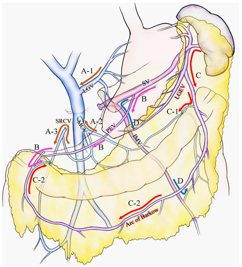 Our group has confirmed that these superior and inferior routes [11,17] reported a high incidence (62.8%) of colonic varices, if both the left gastric vein (LGV) and middle colic vein (MCV) were sacrificed during PD with SV ligation [17]. We emphasized the importance of the superior right colic vein (SRCV) arcade to prevent variceal development at the right flexure of the colon (Figure 1A-3). Thereafter, the LGV, MCV, and the SRCV arcade were defined as the critical veins [11] (Figure 1A), in which LGV corresponds to the superior route (Figure 1A-1), and the MCV and SRCV arcade correspond to the inferior route (Figure 1A-2,3).