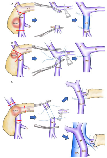 Apart from collateral venous preservation, there are several surgical interventions that can prevent SPH during PD. To preserve the confluence of SV, Cusack et al. introduced the now widely applied [6,36] interposition grafting technique [8,9] (Figure 2A). Clavien et al. reported a wedge resection of the PV to preserve SV confluence during PD (Figure 2B). These techniques are applicable only for tumors that partially invade the PV/SMV. A wide resection of the PV is sometimes necessary in cases of pancreatic head and neck cancer displaying PV/SMV invasion, and this may require the transection of the SV. Although extended PD may require a complex surgical technique, it has the advantage of obtaining a wider surgical margin and could improve the survival chances of patients with PDAC with PV invasion [39]. In the case of SV transection, various types of SV reconstruction can be performed [12,24,31,34,40,41] and several articles reported that SV reconstruction could reduce the incidence of SPH [12,31,42]. SV reconstruction with the PV [42,43,44], IMV [7,24] or LRV [34,41] has been previously described. Although SV-PV anastomosis is simple and feasible [12,42] (Figure 2C), this technique is not applicable in the occurrence of a wide gap between the SV and PV, and has a potential risk of PV stenosis due to the distortion at anastomosis [34]. An SV-IMV anastomosis consists of part of an inferior route and is not a critical vein in preventing variceal formation [10,15]. Therefore, the preservation or restoration of the collateral flow into the IMV is not a substantial solution to prevent SPH [19]. In contrast, SV-LRV anastomosis for extended PD is widely applicable and technically feasible [12,34,41] (Figure 2C). Many other techniques for SV reconstruction, including splenogonadal, spleno-left adrenal, and splenojejunal vein or spleno–interposition graft–PV/LRV anastomoses are technically possible, but these techniques require anastomosis with sall-caliber veins and therefore result in a high incidence of anastomotic obstruction [12].