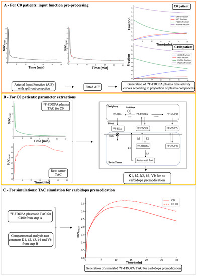 Generation of simulated time-activity curves simulating carbidopa premedication in the tumor volumes of interest (VOIs). The same processes were applied to healthy brain VOIs. (A) For C0 patients: input function pre-processing; (B) For C0 patients: parameter extractions; (C) For simulations: TAC simulation for carbidopa premedication.
