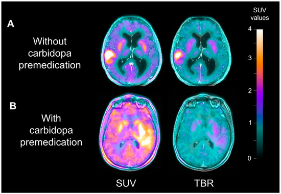 Carbidopa premedication in the present study leads to an approximately 50% higher SUVmean in healthy brain tissue as well as and in brain tumors (Table 2 and Table 3). To the best of our knowledge, to date, only one previously published study evaluated the effects of carbidopa in brain tumors, by comparing two patients with stable brain tumors, premedicated with 200 mg of carbidopa at baseline, and reevaluating these same patients without premedication one year later. Consistent with our study, this previous study also reported a 50% higher uptake in all brain structures, including healthy brain and tumors from acquisitions performed 15 to 25 min post-injection [9].