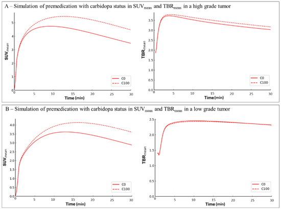 To indirectly confirm our hypotheses and compare the effects of carbidopa premedication on dynamic analysis in the same brain tumor of patients who underwent 18F-FDOPA PET, both without and with premedication, simulations were performed. Simulated TACs of the carbidopa premedication status were computed based on the TACs of 15 patients without premedication, for which raw data were available (median age 58.5 (45.2; 64.1) years, 5 women). Five patients were classified as IDH mutant astrocytomas (3 anaplastic), 4 as IDH wildtype astrocytomas (2 anaplastic), 2 as IDH mutant and 1p/19q co-deleted oligodendrogliomas (1 anaplastic) and 4 as IDH wildtype glioblastomas.