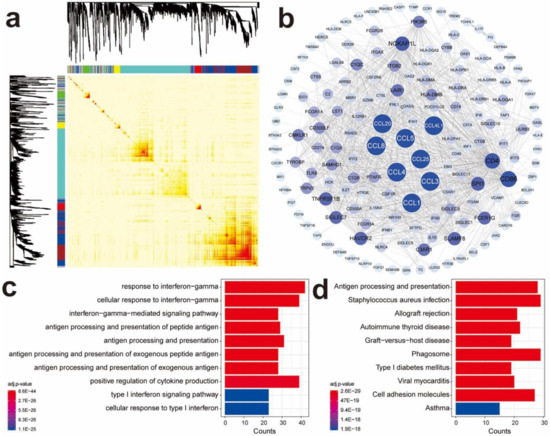 Identifying co-expressed immune genes related to CC chemokine genes by WGCNA. (a) Heat map of the Topological Overlap Matrix in WGCNA analysis; (b) co-expression network of genes in the blue module; (c) GO enrichment of genes in the blue module of co-expression network; (d) KEGG enrichment of genes in the blue module of co-expression network.