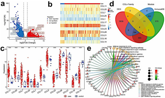 Identifying immune-related hub genes that are differentially expressed in tumor and normal samples. (a) Volcano plot of DEGs in TNBC and normal samples; (b,c) heat map and box plot of differential CC chemokines genes between TNBC (red) and normal samples (blue) (ns: not significant, * p < 0.05; ** p< 0.01; *** p < 0.001); (d) Venn diagram of immune-related genes, DEGs in TNBC and normal samples, genes in the blue and brown modules, and genes of CC chemokines. (e) GO enrichment of immune-related hub DEGs (Top10).