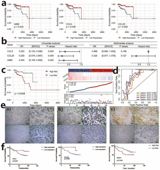 Construct of the immune-related gene prognostic index (IRGPI) in TNBC. (a) Kaplan–Meier survival analysis of AIM2, CCL5, and CCL25 genes that are significant in the univariate Cox analysis (p < 0.05); (b) univariate and multivariate Cox regression analysis of survival-related genes; (c) Kaplan–Meier survival analysis of IRGPI scores using TCGA data and the relationship between the survival status and IRGPI score distribution in the TCGA TNBC cohort; (d) ROC curves of the prognostic models in TNBC (the TCGA cohort) at 1, 3, 5, and 7 years; (e) expression of CCL25, CCL5, PD-L1 in TNBC. (a) Representative samples with CCL25 positive (above) and negative (below) expression; (b) representative samples with CCL5 positive (above) and negative (below) expression; (c) representative samples with PD-L1 positive (above) and negative (below) expression. Scale bars: 200 μm for the left pictures in (a–c), and 50 μm for the right pictures in (a–c); (f) Kaplan–Meier survival analysis of CCL5 and CCL25 expression and IRGPI groups using IHC scores of the patients from our hospital (p < 0.05).