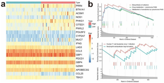Differentially expressed genes in the IRGPI groups showed that 1096 genes were upregulated in the IRGPI-high group while 750 genes were downregulated (Figure 4a, Table S5). The top 10 significantly upregulated and downregulated genes are shown in Figure 4a (Figure 4a, Table S5), and both CCL5 and CCL25 are among the top 10 significantly downregulated genes in the IRGPI-high group. GSEA was performed to determine the gene sets enriched in different IRGPI subgroups. The gene sets upregulated in the IRGPI-high samples were enriched with 10 pathways, including the biosynthesis of cofactors, drug metabolism-cytochrome P450, and metabolism of xenobiotics by cytochrome P450, while the gene sets upregulated in the IRGPI-low samples were enriched with neutrophil extracellular trap formation and human T-cell leukemia virus 1 infection pathways (Figure 4b).
