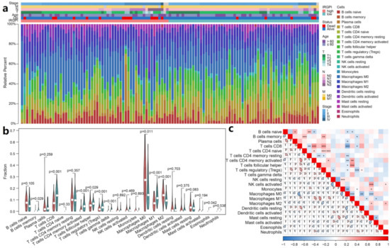 CIBERSORT is a method using gene expression profiles to characterize cell compositions of complex tissues [30]. We used LM22, a leukocyte gene signature matrix containing 547 genes that distinguish 22 human hematopoietic cell phenotypes to determine the levels of immune cell infiltration in TCGA TNBC samples. We obtained the CIBERSORT R script from CIBERSORT website (https://cibersort.stanford.edu/, accessed on 11 January 2021) and analyzed the mRNA expression matrix in combination with LM22 in TNBC samples. The Wilcoxon rank sum test was used to calculate the levels of immune cell infiltration among different IRGPI groups (p values < 0.05), and Spearman correlation was used to calculate the correlation between immune cells (p values < 0.05).