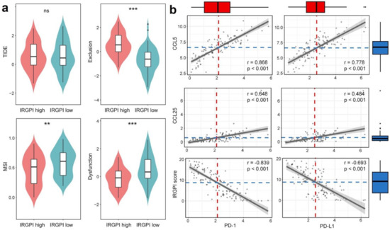 IRGPI is associated with T-cell exclusion and dysfunction, and PD1 and PD-L1 expression in TNBC of TCGA data set. (a) Scores of TIDE, MSI, and T-cell exclusion and dysfunction in different IRGPI risk groups (ns: not significant, ** p < 0.01; *** p < 0.001); (b) Correlation between CCL5/CCL25/ IRGPI scores and PD-L1/PD1.