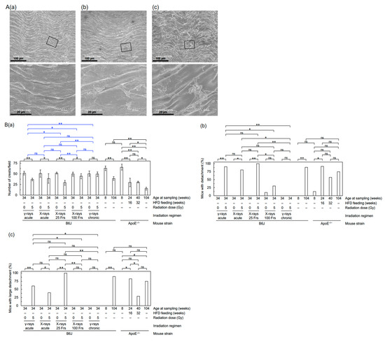 Figure 1. Morphological changes in the aortic endothelium. (A) Representative FE-SEM images of (a) normal endothelium (young mouse), and (b,c) detachment and large detachment, respectively (6 months after starting irradiation with 5 Gy of X-rays in 25 fractions), all in B6J mice. Boxed areas in the upper panels are shown at higher magnification in the lower panels. Scale bars as indicated. (B) Quantitative analysis for (a) the number of crests/field (7–11 mice/group analyzed except for 4 in aged ApoE−/− mice, Welch’s t-test), and (b,c) percentage of mice with detachment and large detachment, respectively (7–11 mice/group analyzed except for 20 in B6J mice at 6 months after irradiation with 0 Gy or 5 Gy of acute γ-rays and 4 in aged ApoE−/− mice, Fisher’s exact test). For an outline of statistical comparisons, see a footnote in Supplementary Materials. Frs, fractions. The data in Figure 1B(a–c) for the two B6J groups receiving 0 Gy or 5 Gy of acute γ-rays were taken from the 2020 Cancers paper [7]. **, p < 0.001. *, 0.001 ≤ p < 0.05. #, 0.05 ≤ p < 0.1 (marginally significant). ns, p ≥ 0.1 (nonsignificant).