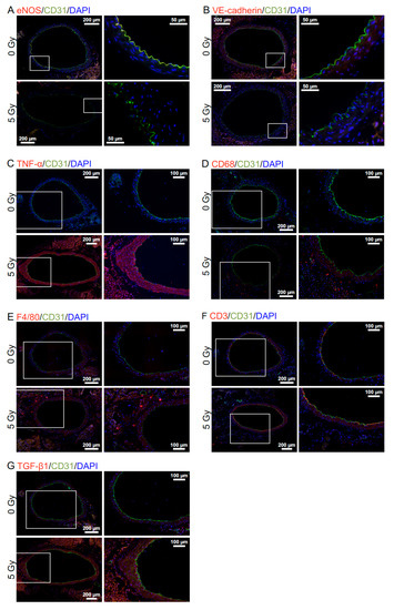 Figure 2. Molecular changes in the aorta. Representative merged images in B6J mice (all at 6 months after starting irradiation) for double immunofluorescence of CD31 with (A) eNOS, (B) VE-cadherin, (C) TNF-α, (D) CD68, (E) F4/80, (F) CD3 or, (G) TGF-β1, with cell nuclei counterstained with DAPI. (A,C,EG) X-rays in 25 fractions. (B,D) X-rays in 100 fractions. Upper panels, 0 Gy. Lower panels, 5 Gy. Boxed areas in the left panels (tiled images) are shown at higher magnification in the right panels. Scale bars as indicated.