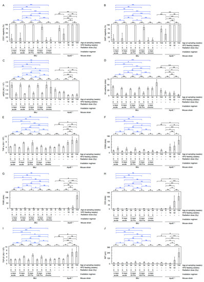 19. Monceau, V.; Meziani, L.; Strup-Perrot, C.; Morel, E.; Schmidt, M.; Haagen, J.; Escoubet, B.; Dörr, W.; Vozenin, M.C. Enhanced Sensitivity to Low Dose Irradiation of ApoE−/− Mice Mediated by Early Pro-Inflammatory Profile and Delayed Activation of the TGFβ1 Cascade Involved in Fibrogenesis. PLoS ONE 2013, 8, e57052. [Google Scholar] [CrossRef] [Green Version]