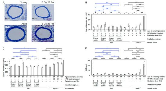 Figure 4. Fibrotic changes in the aorta. (A). Representative images for Masson’s trichrome staining in B6J mice (young, aged, at 6 months after starting irradiation with 0 Gy or 5 Gy of X-rays in 25 fractions). Quantitative analysis for (B) total intensity of aniline blue stain in the entire aortic wall, (C) intensity of aniline blue stain per unit aortic wall area, and (D) IMT (8–10 mice/group analyzed except for 4 in aged ApoE−/− mice, Welch’s t-test). For clarity, a graph replotted for IMT in B6J mice only is shown in Figure S9C. For an outline of statistical comparisons, see a footnote in Supplementary Materials. AU, arbitrary unit. Frs, fractions. **, p < 0.001. *, 0.001 ≤ p < 0.05. #, 0.05 ≤ p < 0.1 (marginally significant). ns, p ≥ 0.1 (nonsignificant).