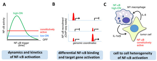 The three layers of NF-κB activation states. (A) Schematic representation of different modes of NF-κB activity. (B) Schematic showing various possibilities of NF-κB binding to specific genomic loci and the functional consequences on transcription. (C) Cellular heterogeneity of NF-κB activation, as exemplified by the interaction between a tumor cell and a neighboring macrophage.