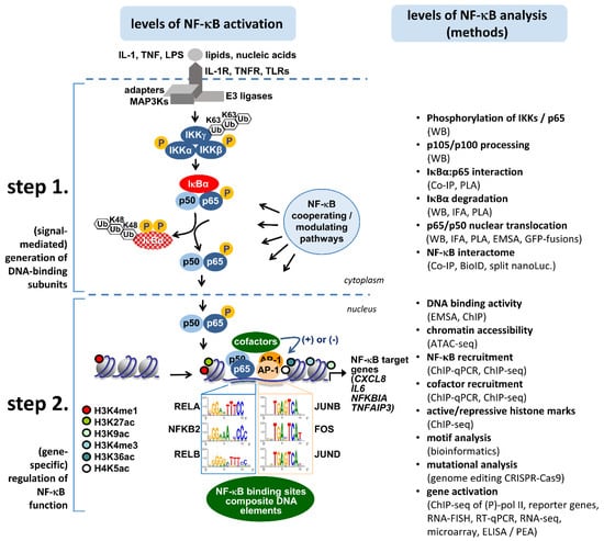 As shown in Figure 2 at least a dozen different methods are available to assess the various intracellular regulatory levels of the NF-κB signaling pathways, which can be divided into a cytosolic (step 1) and a nuclear (step 2) part. Historically, primarily the cytosolic activation pathway has been investigated by a range of well-established methods to detect NF-κB activity. These primarily biochemical assays are still very important, as they yield information on the signal-mediated generation of DNA binding units. To reveal the gene-specific consequences beyond step 1, it is necessary to employ additional approaches. The advent of modern genomics and next generation sequencing (NGS) techniques has caused a shift toward methods that determine the direct occupancy of DNA by NF-κB and cooperating transcription factors at the genome-wide level [33,47,48,49,50,51,52,53]. These methods also deliver information about the status of the surrounding chromatin environment (cofactors, chromatin accessibility, histone modifications). Together with functional assays, they identify the regulatory modes directly controlling NF-κB target genes and thus yield context-specific information on NF-κB activation [54]. It is also important to bear in mind that NF-κB activation rarely occurs in isolation, as typically other stress pathways are activated in parallel. Three prominent examples are the p38, JNK, and JAK kinase pathways, which regulate the expression levels and activities of a large number of transcription factors, such as AP-1 and STAT proteins [55]. These pathways cooperate with the NF-κB system at multiple levels and can profoundly shape the amplitude and duration of the expression of NF-κB target genes [55].
