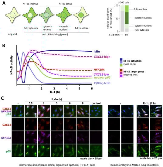 - Mayr-Buro, C.; Schlereth, E.; Beuerlein, K.; Tenekeci, U.; Meier-Soelch, J.; Schmitz, M.L.; Kracht, M. Single-Cell Analysis of Multiple Steps of Dynamic NF-kappaB Regulation in Interleukin-1alpha-Triggered Tumor Cells Using Proximity Ligation Assays. Cancers 2019, 11, 1199. [Google Scholar] [CrossRef] [PubMed]