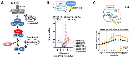 Global or pairwise monitoring of protein/protein interactions in the NF-κB system in living cells. (A) Scheme showing established and putative protein/protein interactions of the canonical NF-κB pathway. (B) The scheme shows the p65-miniTurbo (p65-mTb) fusion protein that was transiently transfected in HeLa cells using a doxycycline-inducible vector system. Expression was induced by 1 µg/mL doxycycline for 18 h. 24 h after transfection, cells were incubated in 50 µM biotin for 70 min and were left untreated or were stimulated with IL-1α for the last 60 min. Biotinylated proteins were purified from cell extracts using streptavidin-agarose beads and identified and quantified by LC-MS/MS using a TimsTOF system. The Volcano plot shows the differences of the mean protein intensities on the x-axis and the results of Student’s T-test on the y-axis comparing untreated with IL-1α-treated conditions. Mean protein intensities were determined from two biological and three technical replicates per condition. Out of 3818 proteins identified in total, 109 were found to differentially bind to p65-mTb upon IL-1α treatment (based on a two-fold cut-off and a p value of -log10 (p) ≤ 1.3, red and blue colors), while p65 and seven further components of the canonical NF-κB pathway were readily detected and evenly present in samples from unstimulated or stimulated cells. This approach holds great potential to comprehensively uncover stable, transient, and weak interactions of NF-κB components with cellular proteins in healthy or diseased conditions. (C) HEK293T-IL1R1 cells, stably expressing the IL-1 receptor type 1, were co-transfected with doxycycline-inducible vectors encoding TRAF6-LgBiT and p62-SmBiT. Protein-expression was induced by doxycycline (1 µg/mL) for 30 h. Promega NanoBIT Live Cell Substrate® was added to allow detection of luciferase activity in living cells. After 15 min of baseline measurement (minute = 0, dotted line), IL-1α (10 ng/mL) was added to three of the dishes as shown (yellow), while further three dishes remained untreated (black). The data were normalized to the first measurement and presented as means (n = 3).