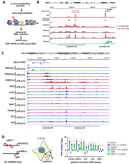 ChIP-seq, ATAC-seq, RNA-seq and genome editing to monitor the nuclear NF-κB pathways and their relevance for gene expression. (A) Principle of ChIP-qPCR or ChIP-seq assays. (B) Integrative genomics viewer (IGV) genome browser views of combined ChIP-seq, ATAC-seq, and RNA-seq analyses of the extended human CXCL8 locus before (blue profiles) and after short-term stimulation with IL-1α (red, green profiles) to reveal (i) the genomic binding sites of p65 to enhancers and promoters, (ii) the presence of active enhancers (defined by inducible H3K27ac and constitutive H3K4me1), (iii) the regions of open or accessible chromatin (by ATAC-seq), and (iv) the resulting mRNA expression of the NF-κB target gene CXCL8. The figure was generated using published data from our laboratories [62,65]. The data can be retrieved from NCBI GEO (https://www.ncbi.nlm.nih.gov/geo, accessed on 12 October 2021) with the accession numbers GSE64224 and GSE52470. The function of the largest p65 peak in the enhancer was analyzed by genome editing as shown in (D) and described in detail in [62]. (C) Co-recruitment of multiple transcription factors together with NF-κB to the murine Il1a enhancers and promoters demonstrating the signal integration of the canonical NF-κB pathway with transcription factors activated by multiple other pathways at the level of chromatin. Samples were derived from LPS-stimulated murine dendritic cells, the figure was produced from ChIP-seq and RNA-seq data deposited in GSE36104 (published in [50]). H3K4me3 is indicative for actively transcribing genes and their promoters. (D) HeLa cells were genome-edited by CRISPR-Cas9 to generate < 60 nt microdeletions of the major NF-κB binding site in the human IL8 enhancer (Δp65eIL8) or to deplete p65 protein expression due to a frame-shift in the first exon (Δp65). Supernatants of cells were analyzed before and after 8 h of IL-1α stimulation for the secretion of proteins encoded by five NF-κB target genes using PEA technology. Mean relative changes plus individual values from three independent experiments are shown. The cell lines are described in detail in [62]. Note the strong suppression of IL-8 (encoded by the CXCL8 gene) and the variable quantitative requirement of NF-κB for basal or inducible protein secretion of further factors. (B,C) Numbers show read counts.