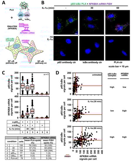 The amount of NF-κB bound to IκBα can be determined by co-immunoprecipitation experiments, but also at the single cell level by proximity ligation assays (PLAs), which are schematically explained in Figure 7A. This technique is based on the binding of two different antibodies to neighboring proteins, followed by hybridization of secondary antibodies which are covalently coupled to short ssDNA molecules. After hybridization of connector oligos to join the PLA probes and their ligation, a closed circle DNA template is formed and amplified by DNA polymerase. Complementary detection oligos coupled to fluorochromes hybridize to repeating sequences in the amplicons and the fluorescent dyes can be detected by fluorescence microscopy and thus indicate the occurrence and intracellular localization of protein/protein interactions [120]. We used this methodology to detect p65/IκBα complexes mainly in the cytosol of cells, as revealed by fluorescence microscopy and its quantitative and statistical analysis [121]. In addition, dynamic changes were observed, as administration of IL-1α resulted in a significant decrease of p65/IκBα complexes, followed by the re-formation of these complexes 90 min after the addition of the stimulus [121]. This experimental approach also allowed to visualize p50/p65 dimers in the nucleus and can be used to detect any other interesting protein/protein complex and also post-translational modifications, provided that suitable antibodies from two different species are available. As shown in Figure 7, PLA can also be combined with smRNA-FISH to detect the amount and intracellular localization of mRNAs [121]. This experiment once again corroborates the notion of the single cell heterogeneity of NF-κB pathway activation, which is expected to crucially determine the tissue reaction to NF-κB-activating stimuli.