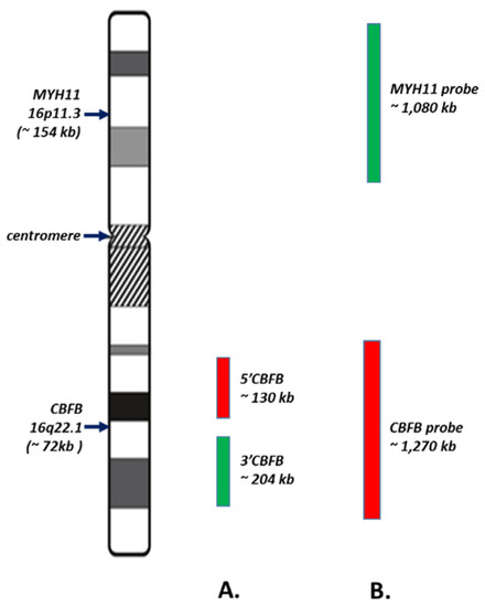 - Hung, D.; St Heaps, L.; Benson, W.; Mirochnik, O.; Sharma, P.; Smith, A. Deletion of 3’CBFbeta in an inv(16)(p13.lq22) ascertained by fluorescence in situ hybridization and reverse-transcriptase polymerase chain reaction. Cancer Genet. Cytogenet. 2007, 172, 92–94. [Google Scholar] [CrossRef] [PubMed]