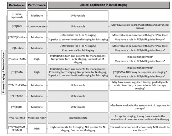 Diagnostic performance, advantages, and disadvantages of different radiotracers in the evaluation of the primary staging of prostate cancer.