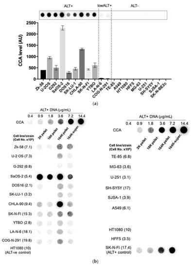 - Lau, L.M.; Dagg, R.A.; Henson, J.D.; Au, A.Y.; Royds, J.A.; Reddel, R.R. Detection of alternative lengthening of telomeres by telomere quantitative PCR. Nucleic Acids Res. 2013, 41, e34. [Google Scholar] [CrossRef] [PubMed]
