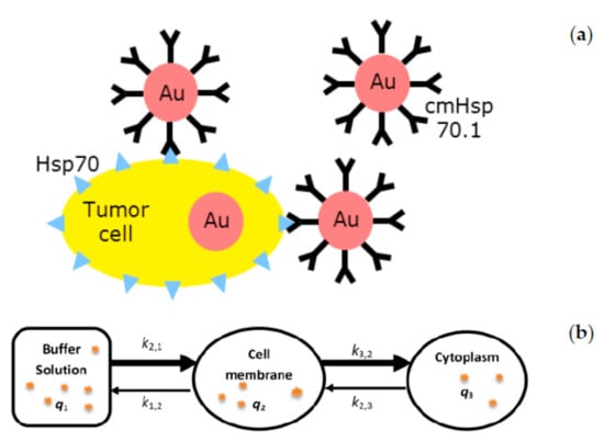 According to the mechanism of the cmHsp70.1 mAb-AuNP-conjugate interaction with tumor cells (Figure 1a), we propose a cellular compartmental model to describe measured concentrations of AuNPs in the tumor cell membrane and the cytoplasm, as shown in Figure 1b. The transfer rates (k) can be estimated by fitting the model to the in vitro data.