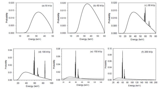 X-ray spectra generated at (a) 50 kVp, (b) 60 kVp, (c) 80 kVp, (d) 100 kVp, (e) 150 kVp and (f) 200 kVp using the SpekCalc program []. The energy bin width in the energy x-axes in all spectra is 500 eV.