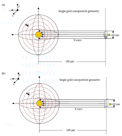 A plane-parallel X-ray beam irradiates a spherical AuNP. The central axis of the beam was aligned to the center of the AuNP. The energy peaks of the X-ray beams were 50 kV and 100 kV. The beams were sampled from a circular plane (Figure 3a) and a square plane (Figure 3b) source positioned 100 µm from the AuNP center. The source diameter of the circular plane and the source perimeter of the square plane were set equal to the diameter of the AuNP plus 10 nm. These definitions of the sources should increase the interaction probability of the X-rays with the AuNP. In the same geometrical conditions without an AuNP, simulations of the interaction of liquid water and X-rays were performed separately.