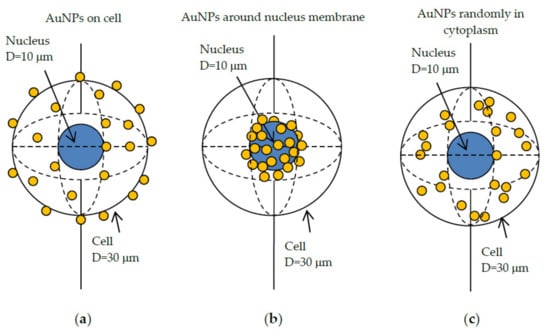 Two concentric spheres were used to model a simple cell structure. One sphere describes the volume of the complete cell of a diameter of 30 μm, the other one for the nucleus in the cell center with a diameter of 10 μm. Simulations with multiple AuNPs were carried out as shown in Figure 4: AuNPs were distributed (a) in the cell surface, (b) around the surface of nucleus and (c) randomly in cytoplasm []. Five sizes of AuNPs in diameters of 100 nm, 74 nm, 50 nm, 14 nm, and 2 nm were used in the simulation. The X-ray spectra applied were 60 kVp, 80 kVp, 100 kVp, 150 kVp, and 200 kVp, covering the energy range of the diagnostic and therapeutic clinical used X-rays []. These parallel X-ray beams were sampled from a circular planar source (diameter of 40 µm) along the z-axis, which was aligned to the center of the cell. The X-ray beam source is situated at a distance of 50 µm from the cell center.