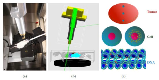Multi-scale Monte Carlo simulation for enhancement effects with AuNPs distributed in a xenograft tumor model irradiated by X-rays []. (a) Small Animal Radiation Research Platform (SARRP) with mouse, (b) Simulation setup of the SARRP with mouse voxel phantom and (c) Computational models of tumor, cell and DNA implemented in TOPAS-nBio.