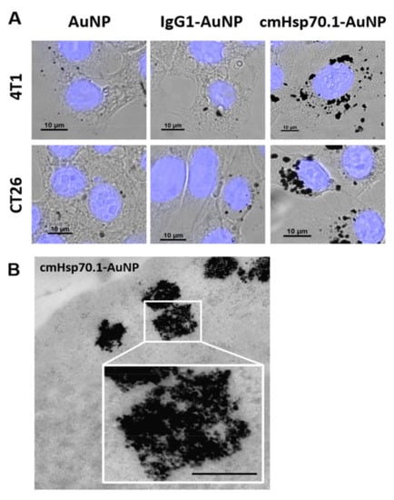 Three different types of AuNP-conjugates, cmHsp70.1 mAb-AuNPs, and IgG1-AuNPs, and unconjugated AuNPs were incubated with tumor cell lines 4T1 and CT26 for 24 h at 37 °C to simulate the AuNP-uptake []. In both tumor cell lines, the uptake of cmHsp70.1 mAb-AuNPs was superior to that of unconjugated or IgG1-control NPs (Figure 6A, []). Figure 6B shows the accumulation of cmHsp70.1 mAb-AuNPs in intracellular vesicles of 4T1 cells after 24 h incubation at a higher magnification [].