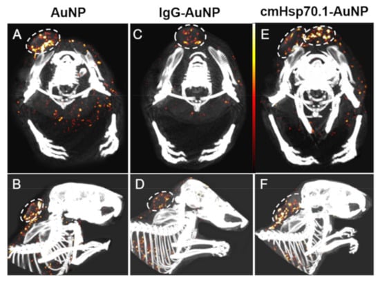 Spectral-CT imaging []: upper row for axial view and bottom row for sagittal view. (A,B) unconjugated AuNP in CT26 tumor; (C,D) IgG1-AuNP in CT26 tumor and (E,F) cmHsp70.1 mAb-AuNP in CT26 tumor. Copyright of Cancers (Basel) 2020, 12, 1313; doi:10-3390/cancers12051331 [].
