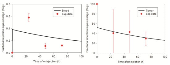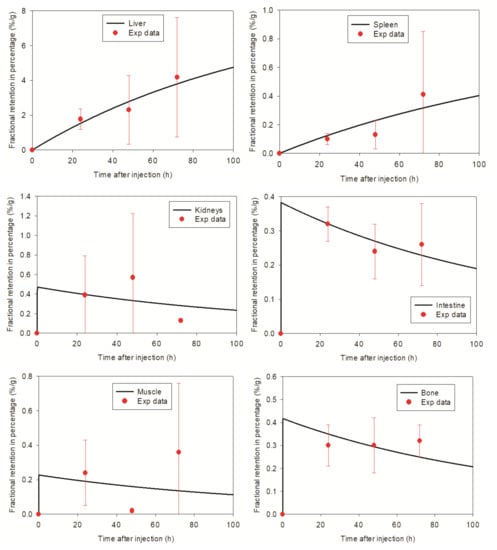 Comparison of model predictions and measured biodistribution data in mice for tumor, blood, liver, spleen, kidneys, muscle, bone and intestine. The red dots and error bars represent the mean values of the measured biodistribution data at a single time point and the standard deviations, respectively. The black curves predict the biokinetic retentions of SPIONs in mice by the pharmacokinetic model and model parameters k. shown in Table 3. The y-axes present the percentages of the retained dose per gram after injected amount of SPIONs directly in tumor. “Intestine” denotes the contents of the small intestine in mice. Because of a very low retention fraction, say, <0.1% at each time point, the respective plots for other organs and tissues, such as lungs, skin, heart, colon, etc. are not shown here [].
