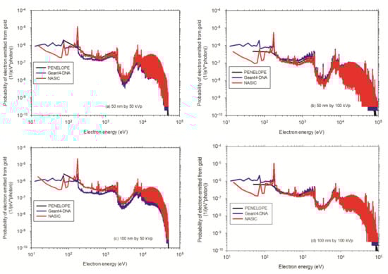 Regarding Figure 10, the emission of Auger electrons in gold is dominant in the M-shell and N-shell with a probability of 98.5%. About 33% of Auger electrons have energies of 200–300 eV in the M-shell. In the 200–300 eV energy range of the electron spectra, these Auger electrons primarily contribute to a dose enhancement in the lower nanometer ranges of 10 nm. Electrons of higher energies mostly originate from the interactions of produced X-ray fluorescence with gold inside AuNPs and small parts of Auger electrons with higher energies, of approximately <8 keV. These electrons may contribute to the dose enhancement in the micrometer ranges. The electron energy spectra at low energy, e.g., 100 eV, shows a large variation. For gold, the Livermore physics model in Geant4 was used for the simulation with Geant4-DNA, and the electrons were scored on the surface of the nanoparticle.