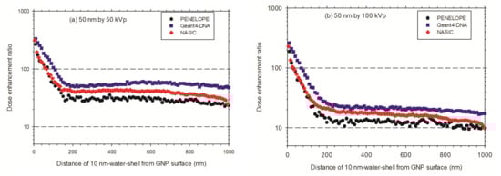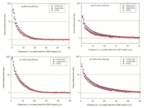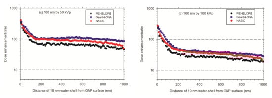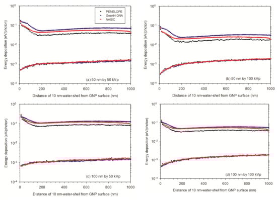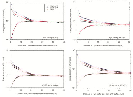 In the nanometer ranges, after irradiation with 50 kVp X-rays (Figure 11a,c), the energy deposition (ED) in the water shells around the 100 nm AuNP surface is greater than that of 50 nm AuNPs. With an AuNP present, the ED ranges from 0.4 eV/photon in the first 10 nm-thick water shell to 0.1 eV/photon in the 16th 10 nm-thick water shell for the 100 nm AuNP in comparison to 0.2 to 0.06 eV/photon for the 50 nm AuNP. Without AuNP, the ED in the water shell is very flat. For 100 nm AuNP, the ED starts from 7 × 10−4 eV/photon and increases slowly to 2 × 10−3 eV/photon, and for 50 nm AuNP, the ED starts from 5 × 10−4 eV/photon and increases to 2 × 10−3 eV/photon. For the cases of irradiation by 100 kVp X-rays (Figure 11b,d), the ED in the water shell around the 100 nm AuNP surface is also greater than the 50 nm AuNP both in nanometer and in micrometer ranges and with and without AuNP. In the presence of a AuNP, the ED ranges from 0.2 eV/photon in the first 10 nm-thick water shell to 0.05 eV/photon in the 20th 10 nm-thick water shell for the 100 nm AuNP in comparison to 0.1 to 0.04 eV/photon for 50 nm AuNP. Without AuNP, the ED in the water shell is also very flat, for 100 nm AuNP, the ED starts from 4 × 10−4 eV/photon and increases slowly to 2 × 10−3 eV/photon, and for 50 nm GNP, the ED starts from 3 × 10−4 eV/photon and increases to 2 × 10−3 eV/photon.