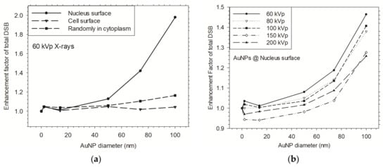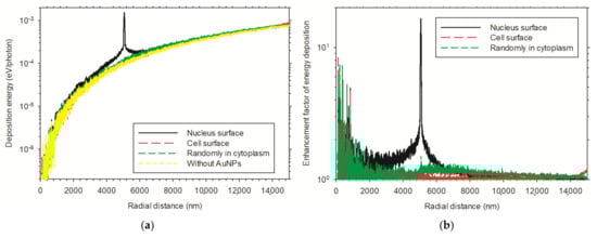 PARTRAC code [] was used to simulate the enhancement effects, which can be divided into two parts: one for the physical quantities obtained directly from the track structure, such as primary energy, interaction position, and deposition energy etc.; the other for the biological quantities, which are derived from the superposition of the track structure and the invoked detailed nucleus model. In simulations, the cutoff energy was set as 50 eV for photons and 100 eV and 10 eV for electrons in gold and liquid water, respectively. The radial distribution of average energy deposition within the whole cell volume was restored. The spherical cell model was divided into 15,000 shells. Each shell was 1 nm thick. Hence, 1 × 108 primary photons were transported for the simulation of the physical part. In the biological simulation part, the radiation-induced DNA strand breaks, including single strand break (SSB) and double strand break (DSB), were simulated for the three distributions of multiple AuNPs irradiated by the X-ray beams. The number of primary photons in the biological part was 2 × 109. To quantify the enhancement effect, an additional set of simulations using the identical condition, but without AuNPs was performed. The enhancement factor (EF) was therefore calculated as the ratio of a specific quantity obtained with presence and absence of AuNPs [].