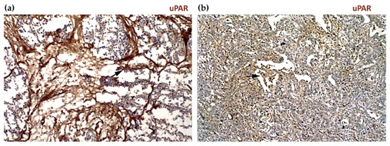- Hildenbrand, R.; Niedergethmann, M.; Marx, A.; Belharazem, D.; Allgayer, H.; Schleger, C.; Ströbel, P. Amplification of the urokinase-type plasminogen activator receptor (uPAR) gene in ductal pancreatic carcinomas identifies a clinically high-risk group. Am. J. Pathol. 2009, 174, 2246–2253. [Google Scholar] [CrossRef]