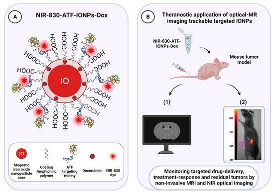 | Amphiphilic polymer-coated NIR-830-ATF-PEG-IONPs | Dox | pH-sensitive | MRI and NIR | Preclinical | Orthotopic human breast and pancreatic xenograft mouse models | [238] |