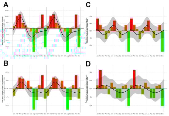 To exclude statistical inaccuracies in data generation, we also built similar spline models for the incidence rates of other cancer entities such as liver, ovary, breast and prostate cancer, confirming seasonality of incidence rates for prostate (Figure 2A, p < 0.001, n = 48,692) and breast (Figure 2B, p = 0.001; n = 51,793) cancer, but not for liver (Figure 2C, p = 0.139, n = 9339) and ovarian cancer (Figure 2D, p = 0.812, n = 6791), (Figure 2). These findings are in line with the published data about seasonal patterns in new cancer diagnoses [1] corroborating the correct data captured in our registry study.