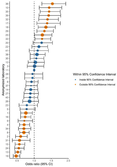 Forest plot showing the adjusted odds ratios (ORs) and 95% confidence intervals (CIs) of ISUP Grades 1 versus 2–5 prostate cancer grade in comparison to the reference laboratory (#11). Dot size indicates the total number of reported prostate cancers per laboratory. Orange dots indicate laboratories with a significantly deviant OR compared to the reference laboratory.