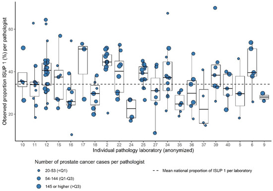 Box plots showing the observed proportion of ISUP Grades 1 versus 2–5 per pathologist (dots) within 21 laboratories relative to the mean national proportion for ISUP grade.