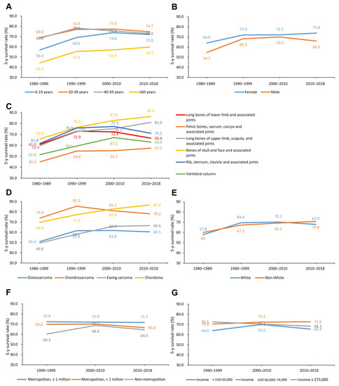 Figure 2. Time trends in 5-year CSS rates by decade in the categories by age (A), sex (B), primary site (C), histological type (D), racial (E), geographic (F), and economic (G). CSS: bone sarcomas-specific survival.