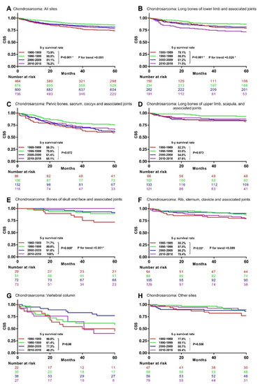 The univariable analysis for chondrosarcoma patients manifested that their 5-year CSS rates significantly increased from 73.9% in the 1980s to 85.5% in the 1990s, but then decreased to 81.1% in the 2000s and 78.2% in the 2010s (Figure 4A). Significant survival changes were observed in chondrosarcoma at long bones of lower limb and associated joints (Figure 4B), bones of skull and face and associated joints (Figure 4E), rib, sternum, clavicle, and associated joints (Figure 4F), but not at the other primary sites (Figure 4C,D,G,H).