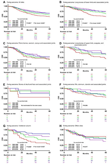 The univariable analysis for Ewing sarcoma patients indicated that their 5-year CSS rates significantly increased from 49.6% in the 1980s to 58.1% in the 1990s, 65.9% in the 2000s, and 66.6% in the 2010s (Figure 5A). Similar significant survival improvements were observed in Ewing sarcoma at long lower limb bones, associated joints (Figure 5B), and vertebral column (Figure 5G), but not at the other primary sites (Figure 5C–F,H).