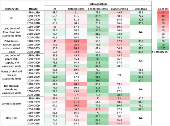 Figure 7. A heat map visually showing 5-year CSS rate changes in histological type and tumor site-combined categories. CSS: bone sarcomas-specific survival.