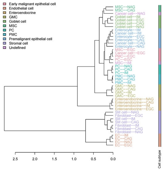 To explore the hierarchical relationship among cell types in the cascade from gastritis to EGC, agglomerative hierarchical clustering was performed on the gastric scRNA-seq data set. The counts of single-cell gene expression data were summarized across all cells mapped to the same cell type and subject. We then normalized the count summarization matrix by the transcripts per million (TPM) method. Next, we used the two-way analysis of variance (ANOVA) F test to identify cell type specific expressed genes. The main effects of cell type and subject were analyzed. The ANOVA analysis tested for differentially expressed genes between a cell type and all other cells. The cell-type-specific expressed genes were identified as the top N genes with high a F value of cell type compared to the F value of the subject. We varied N from 50 to 200 with step 50 and found that the clustering result is less sensitive to the value of N. Assignment of data points to cluster goblet cell does not change when . Assignment of data points to cluster premalignant epithelial cell (PMEC) does not change when . Assignment of data points to other clusters does not change when varying the value of N (Figure 1 and Figures S1–S3). Therefore, we selected the top genes with high F values of cell type compared to F values of subjects as the cell-type-specific expressed genes. We next computed the mean expression for the cell-type-specific expressed genes across expression profiles mapped to the same cell type and stage. The hierarchical cluster tree was generated using the Pearson correlation coefficient () as the pairwise distance on the log-transformed mean expression profiles and Ward’s linkage distance as the cluster distance. Ten non-immune cell populations consisting of EMEC, PMEC, enteroendocrine, GMC, goblet cell, MSC, PC, PMC, endothelial cell, and stromal cell were identified from the cluster tree (Figure 1). The mapping of 11 non-immune cell types of patients with NAG, CAG, IM, and EGC to 10 cell populations is provided in Table S2 and Figure 2.