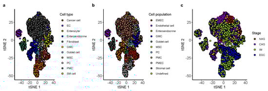The t-SNE plot of whole transcriptomes of 24,874 cells from gastric antral mucosa biopsies. (a) The 11 cell types are denoted by distinct colors. (b) The 10 identified cell populations are denoted by distinct colors. (c) The 4 stages are denoted by distinct colors.